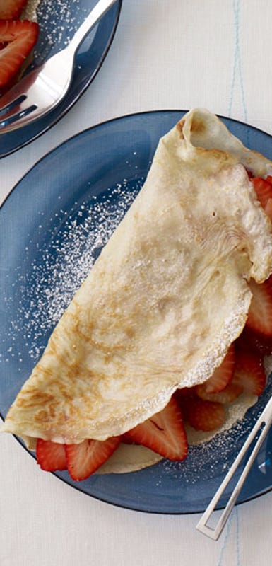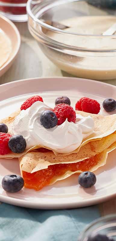 You won’t need a crepe pan to make any of the following crepe recipes! Instead, you can use a large non-stick skillet or purchase frozen crepes—simply heat and fill with fresh or cooked fruit. A blender or food processor makes quick work of the crepe batter and, like pancakes, generally benefits from a resting time of 15-30 minutes. For more savoury lower Point crepe filling options, try crumbled turkey bacon, a poached egg, leftover sautéed or roasted veggies, or shredded reduced-fat cheddar, gouda, or mozzarella.
