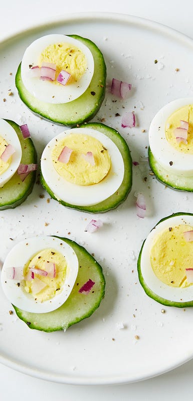 - Dice a hard-boiled egg, toss with plain nonfat Greek yogurt and some Dijon mustard, season, and eat in lettuce cups or piled onto whole-grain crackers.