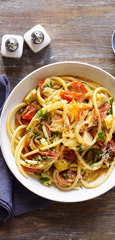The beauty of using pasta or noodles as the base of your meal is that anything goes. Got some past-their-prime veggies? Stir fry them, drizzle in a sauce, and toss them with some noodles. Not sure what to do with some random slices of bacon and a couple of tomatoes? Add onion, some Parmesan cheese, and a box of penne, and you've got yourself a crowd-pleasing meal that's ready in less than 30 minutes.