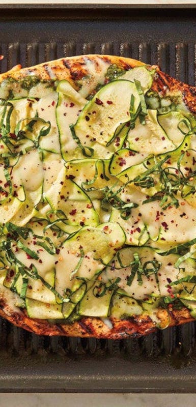 Once you get the hang of grilled pizza, you'll be bummed at all the time you lost NOT tossing your pizza onto the grill. Replace the pesto with tomato sauce and top with different combos of veggies (quick-cooking or precooked ones work best here) like grilled onions, sautéed mushrooms, or tomato slices.