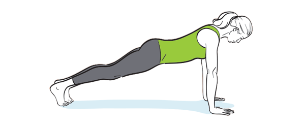 1) Check yourself to be sure you’re not slipping out of form. The most common slips: letting your hips sag to the ground, hiking your butt in the air, and hunching your shoulders forward. “When your body starts to shake and you feel like you want to quit, this is when you’ll know change is happening,” says Olson. Power through your reps and you’ll see progress every day.