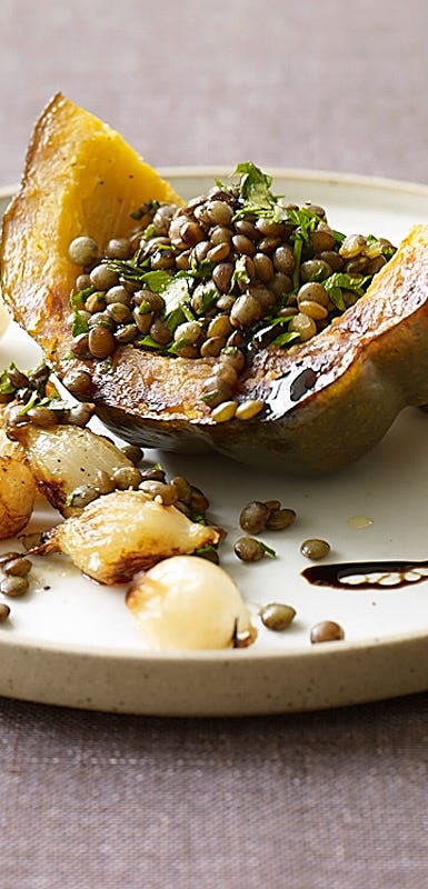 - Green lentils with sautéed mushrooms, roasted shallots, crème fraiche, and fresh dill