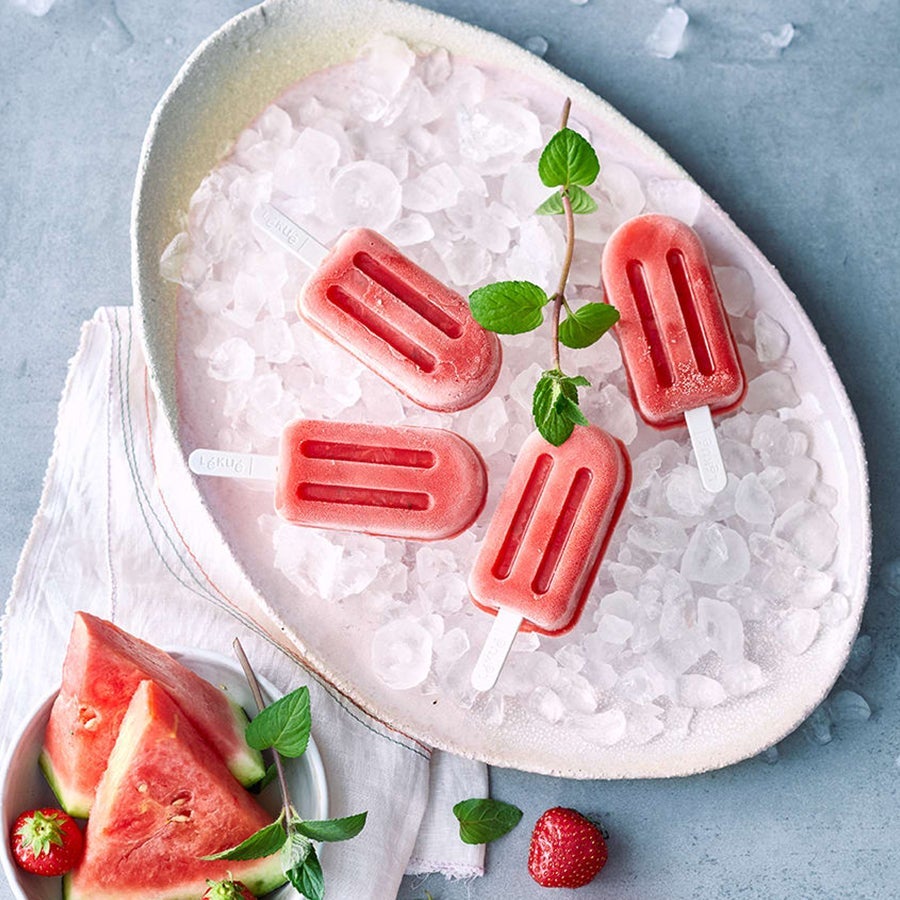 This refreshing popsicle recipe makes use of in-season strawberries and watermelon to create a perfect iced treat for hot summer days. When selecting a watermelon, look for fruit that is heavy for its size with an orange field spot — this is a good indication the melon will be sweet and crisp. No popsicle mould? Try using small paper cups or lined muffin tins instead. Alternatively, freeze the fruit purée in ice cube trays and add the frozen strawberry-watermelon popsicle cubes to a glass of sparkling water.