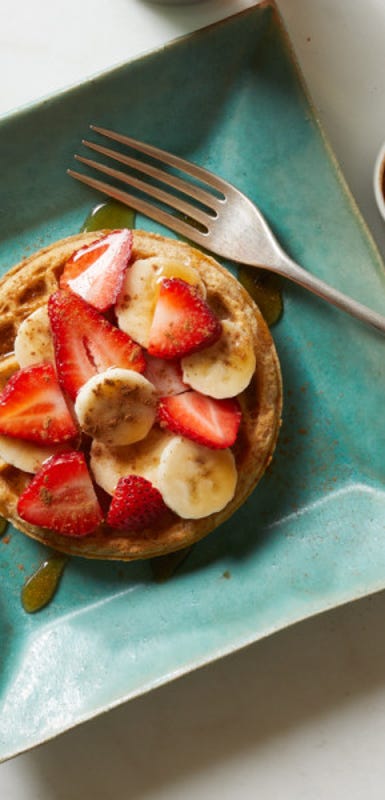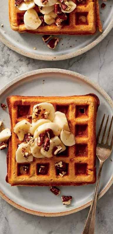 If you like to start the day with something sweet, these waffle recipes are a great place to begin. For recipes using bananas in the batter, unless otherwise indicated, use overripe, soft fruit — the same kind used for making banana bread. The fruit-based toppings can be altered to suit what’s seasonally available, simply sub in the same amounts with the fruit of your choice.