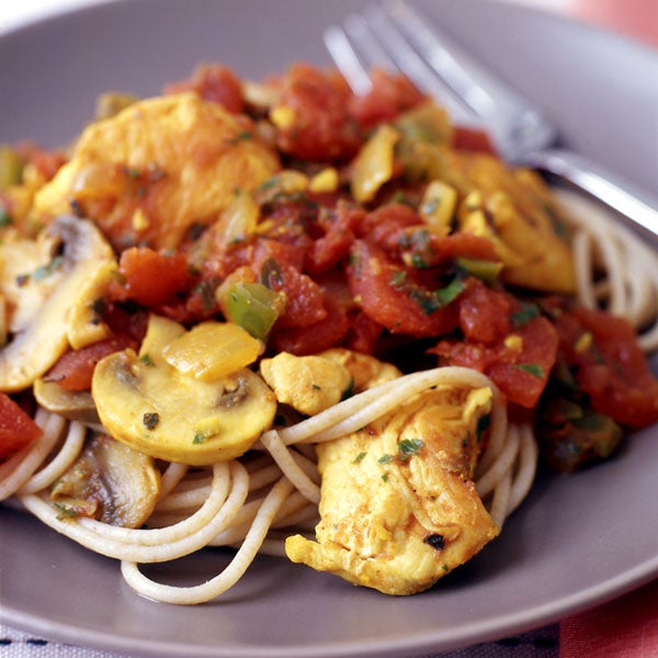 Simmered in a rich tomato sauce with peppers, mushrooms and whole-wheat pasta, this dish truly satisfies. A touch of curry powder gives it just the right kick.