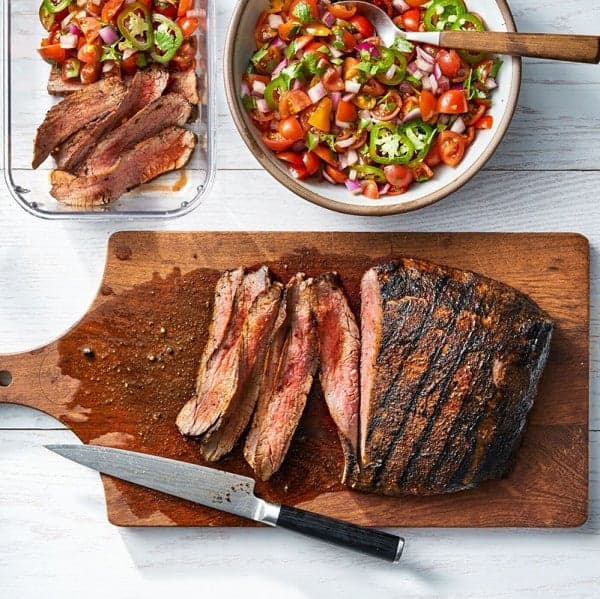 Get out of the steak-and-a-bake rut with this brown sugar and ancho–seasoned steak served with a colourful fresh salad. The fantastic rub really takes flank steak to the next level. During the winter, use a stovetop grill pan to cook the steak. In addition to being a fantastic dinner option, flank steak is a great lunchtime building block that will last for up to 4 days in the fridge and up to 3 months in the freezer. Sliced steak is great in quesadillas with cheese and caramelized onions. It's also great tucked into a roll and topped with lettuce, tomato, horseradish, and light mayonnaise.