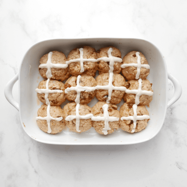 Cool the rolls in the dish on a wire rack for at least 20 minutes. Meanwhile, in a small bowl, stir together the remaining ¼ cup yogurt, 2 tablespoons powdered sugar, and ½ teaspoon vanilla extract. Transfer the yogurt glaze to a small zip-top plastic bag; seal the bag and snip a small hole in one bottom corner of the bag. Pipe a cross shape on top of each bun.