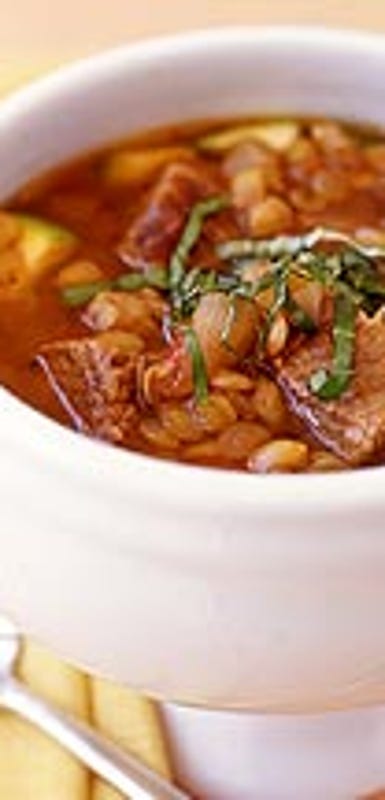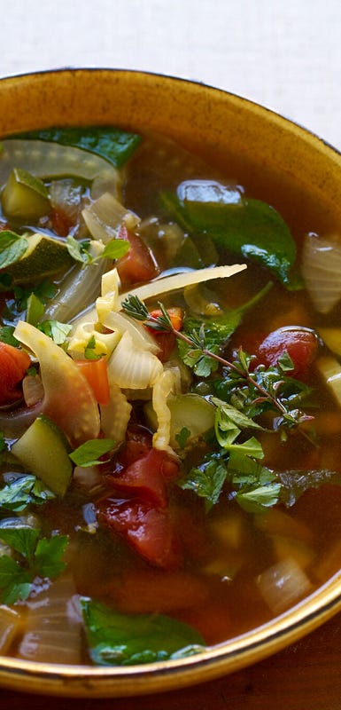 Quel est le repas qui peut être préparé rapidement en utilisant des légumes flétris ainsi que des restes, qui dépend surtout des aliments en conserve et des incontournables du congélateur et qui peut être économique? La soupe!