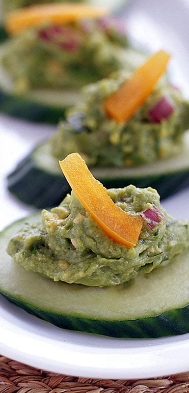 - Garnissez des rondelles de carottes épaisses ou de concombres de houmous ou de guacamole et de sauce piquante.