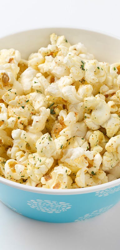 - Vaporisez de l’enduit à cuisson sur le maïs soufflé et mélangez en y ajoutant votre mélange d’assaisonnements préféré ou du parmesan râpé.
