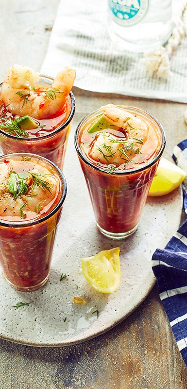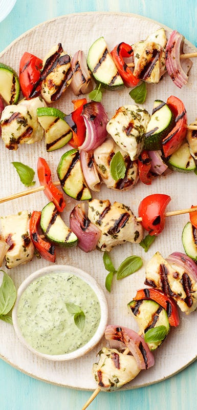 Pourquoi ne pas célébrer le retour de la saison des grillades avec un assortiment de petites bouchées sur brochettes? Inspirez-vous des tapas espagnoles et présentez ces plats de dégustation servis sur des plateaux de service colorés. Au lieu de la traditionnelle sauce barbecue, nous avons utilisé une sauce pesto crémeuse et délicieusement verte comme marinade saine pour le poulet grillé, tandis que les crevettes entières bien dodues s’agrémentent d’une sauce au poivron grillé fumé. N’hésitez pas à choisir les recettes de type tapas qui vous plaisent le plus. Il n’y a aucune obligation de réaliser tous les types de brochettes énumérés ci-dessous. Servez la gaspacho épaisse avec l’avocat et les crevettes dans des verres à eau ou à vin, en les disposant sur un plateau avant la grande occasion pour faciliter le service.