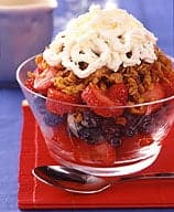 Mettre les bleuets et les fraises dans un plat en verre de 8 x 8 pouces, en alternance pour faire des bandes. Saupoudrer de la préparation à l'avoine, décorer d'un nappage fouetté et servir. (Napper juste avant de servir afin que le nappage reste lisse et croquant.) Donne des portions d'environ ½ tasse.