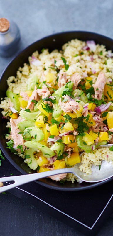 Bereite statt kompletter Rezepte einfach einzelne Zutaten vor, die du nach Lust und Laune kombinieren kannst. Nudeln, Reis, Quinoa, Hähnchenfleisch, verschiedene Gemüse …