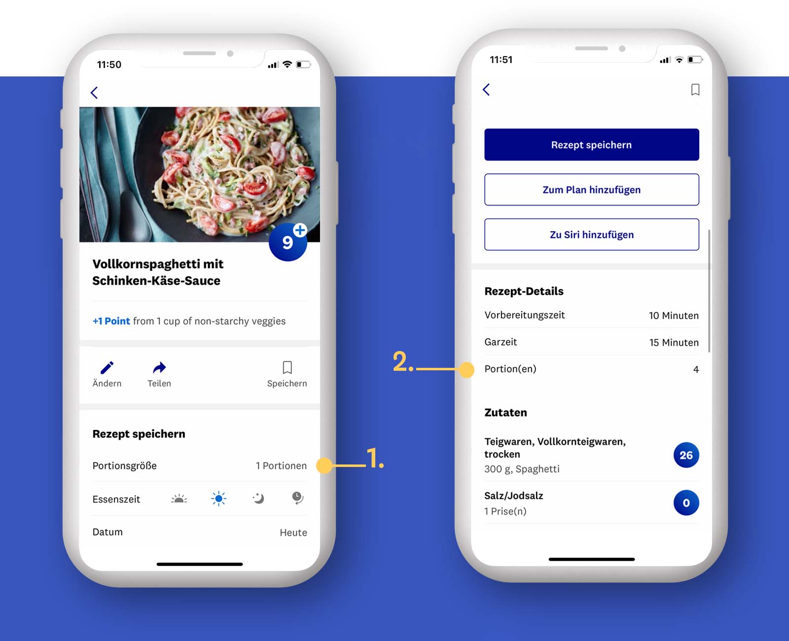 Die für dich richtige Portionsgrösse hängt davon ab, was du isst und wie viel du benötigst, um satt zu werden und gleichzeitig dein Points® Budget einzuhalten. Zu Hause ist das „Essen nach Points®“ meist einfach. Waage und Messbecher sind griffbereit. Jetzt noch Lebensmittel in der App suchen, Menge eingeben, fertig. So hast du dein Points® Budget gut im Griff und lernst mit der Zeit, welche Mengen dich satt machen.