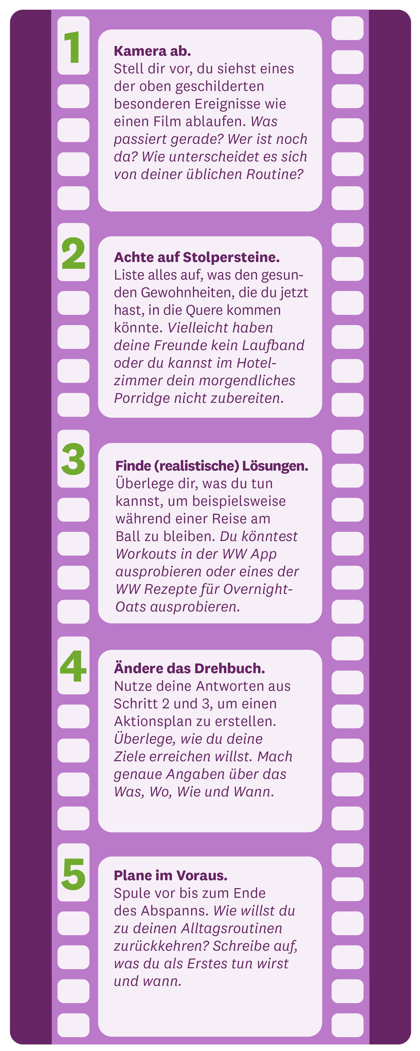 Du fragst dich, wie du während eines Wochenendtrips, einer Geschäftsreise oder einem grossen Fest am Ball bleiben kannst? Bleibe flexibel bei deinen Routinen und überlege vorab, wie du mit möglichen Stolpersteinen umgehen willst. So weisst du zum Zeitpunkt X, was du tun kannst.