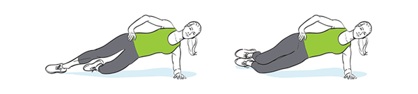 Deine Position: Lege dich mit deiner rechten Seite auf den Boden. Lege die Beine so übereinander, dass dein linkes Bein über deinem rechten liegt. Platziere nun deinen rechten Unterarm auf den Boden und drücke deine Hüfte in Richtung Decke, sodass sich dein Körper anhebt; halte dabei deine linke Hand an deiner linken Hüfte.