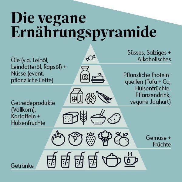 Die klassische Ernährungspyramide enthält Fleisch, Wurst, Fisch und Ei. Daneben gibt es mittlerweile aber auch eine vegetarische und eine vegane Ernährungspyramide– die sind vor allem dann interessant, wenn (komplett) auf tierische Lebensmittel verzichtet wird und es gilt, die Nährstoffe, die in tierischen Lebensmitteln enthalten sind, durch pflanzliche Lebensmittel zu ersetzen.