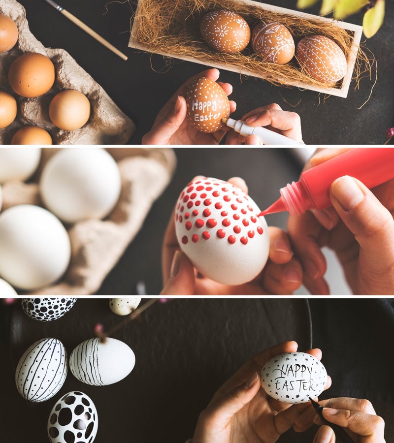 Irgendwie hat man ja doch Lust, die Eier für den Osterbrunch selber anzumalen ... aber dieser Aufwand und dieses Chaos! Da kauft man am Ende lieber die gefärbten Ostereier aus dem Supermarkt. Doch Eierfärben geht auch super easy und ohne grosse Farbkleckserei. Alles, was man braucht, ist ein Filzstift und schwups hat man die schönsten Muster, Widmungen, Blumen etc. kreiert.
