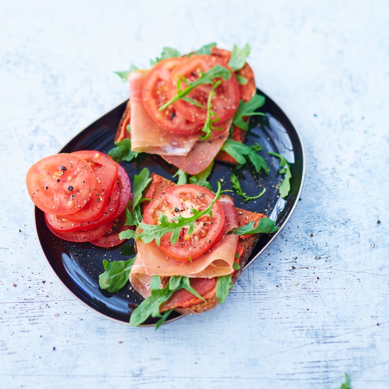 Roggenvollkornbrot mit Rohschinken, Rucola und Tomaten