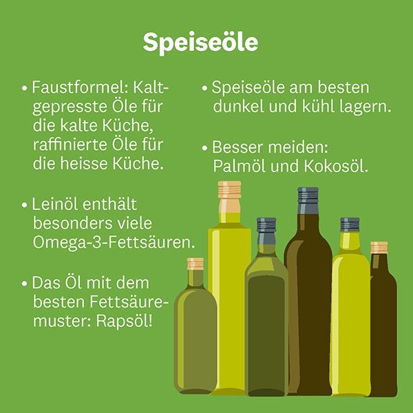 Welches Öl verwende ich am besten zum Braten? Welches Öl hat die meisten Omega-3-Fettsäuren und was ist der Unterschied zwischen kaltgepresst und raffiniert? Hier kommen die wichtigsten Fakten: