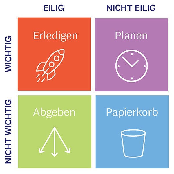 Schreib dir alle deine Aufgaben auf und entscheide: Was ist wirklich wichtig? Was kann jemand anderes erledigen? Und was darf sogar direkt gestrichen werden? Falls dir die Priorisierung schwerfällt, probiere es mal mit dem Eisenhower-Modell.