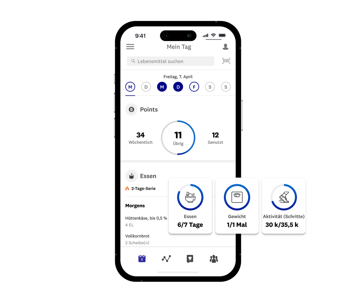 Du erhältst dein individuelles Points Budget, das du für jedes beliebige Lebensmittel „ausgeben“ kannst. Tracke dein Essen in der App. Solange du dein Budget einhältst, nimmst du ab.
