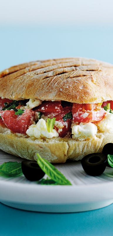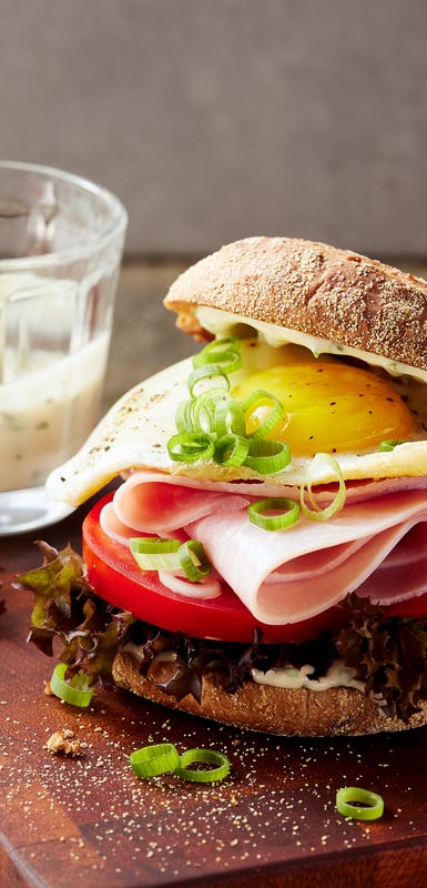 3. Garnir la moitié inférieure du petit pain de salade. Dresser l’omelette sur la salade et recouvrir le tout avec la moitié supérieure. Servir.