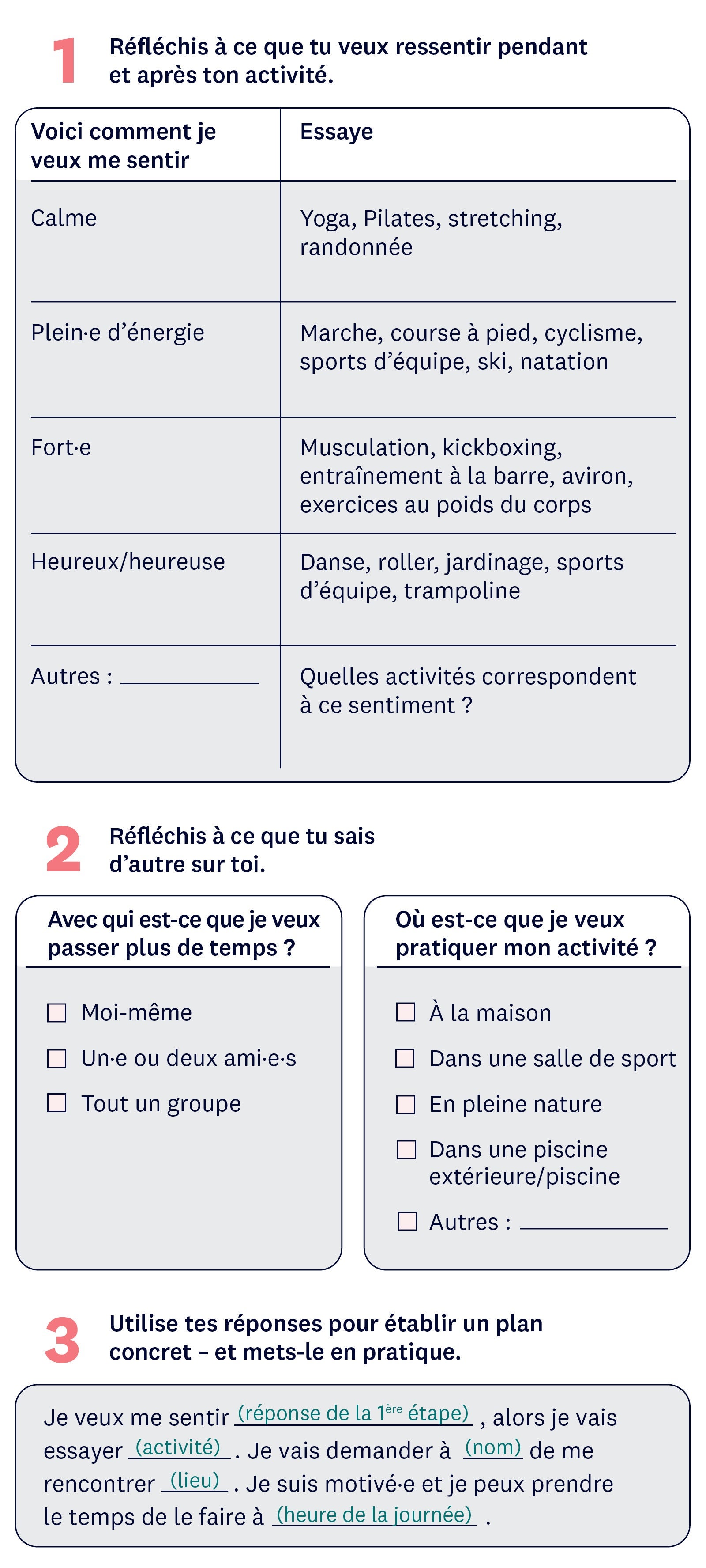 Découvre, tel un détective, ce que tu aimes vraiment faire au lieu de courir après ce que tu penses devoir faire. Ensuite, assemble les pièces du puzzle : Tu veux te sentir fort·e mais tu n'es pas un·e grand·e fan des salles de sport ? Essaie de faire des exercices au poids du corps à la maison. Tu aimes être dans la nature, mais tu ne veux pas être seul·e ? Cherche un club de randonnée.