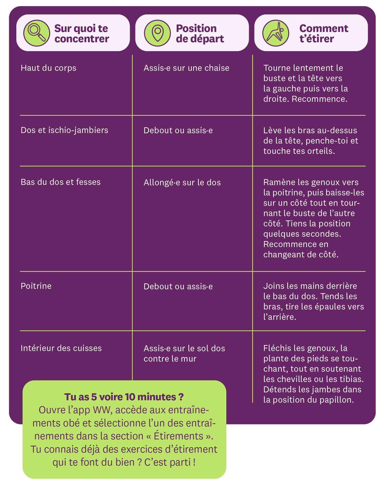 Tu ne disposes que d’une minute ou deux? Fais un (ou plusieurs!) des étirements suivants.