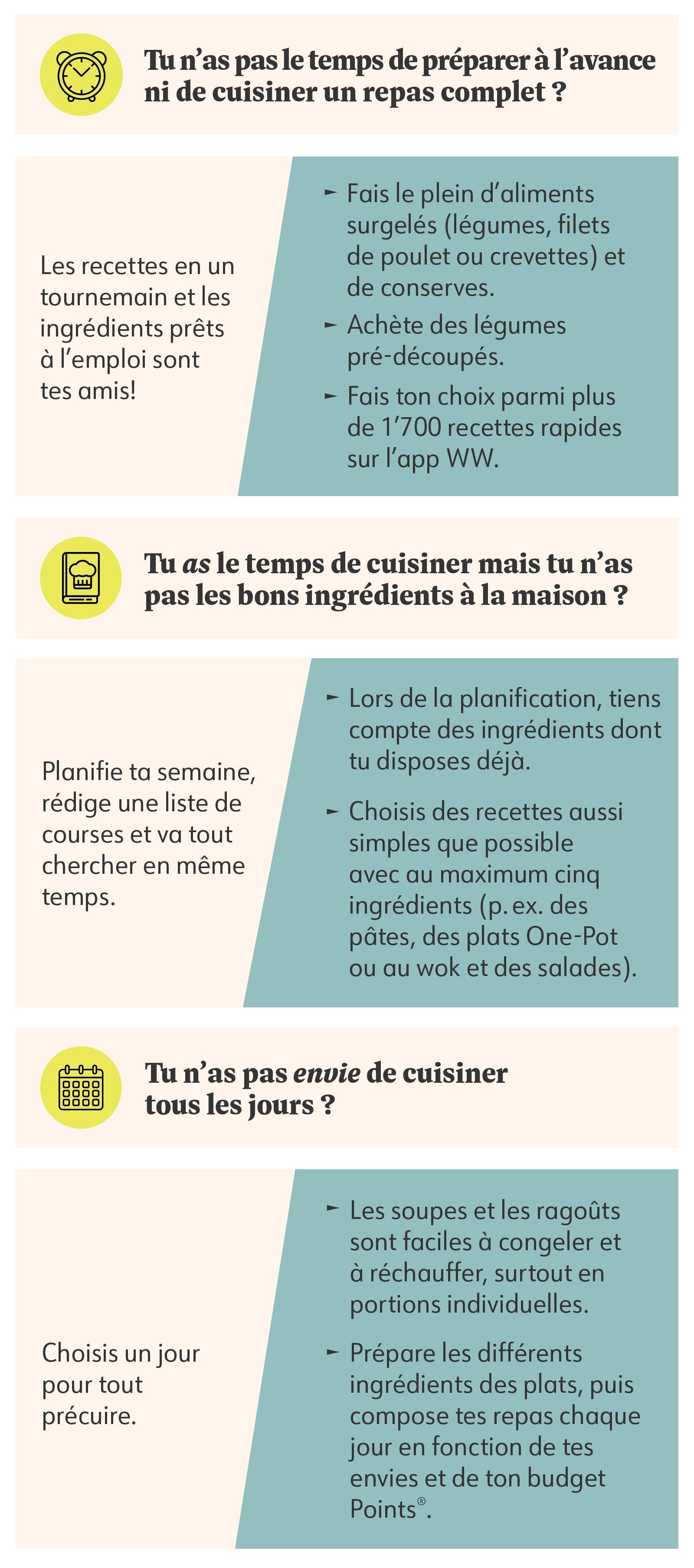 Des études montrent que les repas cuisinés à la maison permettent d’économiser des Points® et de rester sur la bonne voie. Mais bien sûr, la vie a toujours son mot à dire. Travail, famille, pas envie de cuisiner... Il y a toujours quelque chose pour se mettre en travers de ton chemin et t’empêcher de faire les courses, de découper, de préparer... Cependant, en développant des stratégies pour préparer des repas rapides pour peu de Points même si tu manques de temps, il te sera plus facile d’atteindre tes objectifs. Et ce, même si ton emploi du temps chargé ou irrégulier sème la zizanie.