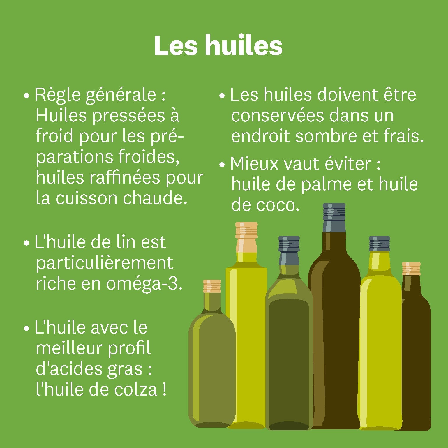 Quelle huile est la plus adaptée aux plats chauds ? Quelle huile contient le plus d’acides gras oméga-3 et quelle est la différence entre une huile pressée à froid et une huile raffinée ? Voici les faits les plus importants :