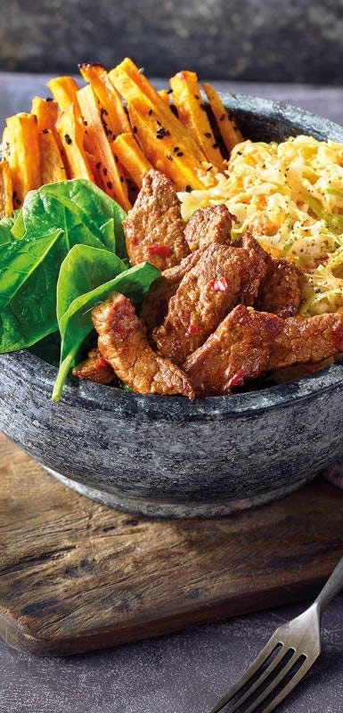 - Et tu finis avec une source de protéine. Par exemple, un steak, une darne de saumon, un oeuf, un émincé de tofu ou du fromage.