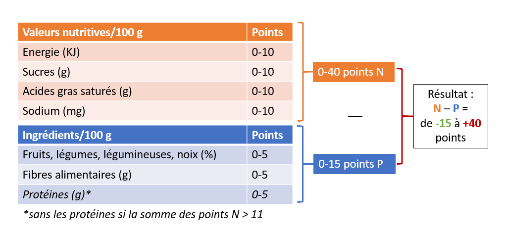 Il est calculé pour 100 g de produit solide ou 100 ml de liquide. Il suffit ensuite de soustraire les positifs aux négatifs et on obtient le Nutri-Score.