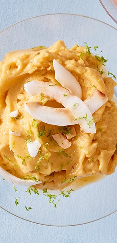 - Placer la préparation dans un sachet congélation et placer au congélateur env. 2 heures. Mélanger la préparation à la fourchette. Répéter la procédure 2 fois et prolonger la congélation 2 heures supplémentaires. Servir le sorbet à la mangue garni du zeste de citron vert.