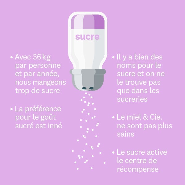 Nous aimons le sucré, à telle point que nous dépassons l’apport recommandé. Selon les experts, notamment la Société Suisse de nutrition (SSN), le sucre ne doit pas représenter plus de 10 % de l’apport énergétique total. Cela revient donc, pour un apport journalier de 2 000 kcal à 50 g de sucre par jour. Actuellement, nous mangeons environ 98 g par jour ! Problème : trop de sucre peut être mauvais pour la santé et entraîner surpoids, obésité, maladies cardiovasculaires, diabète et caries dentaires..