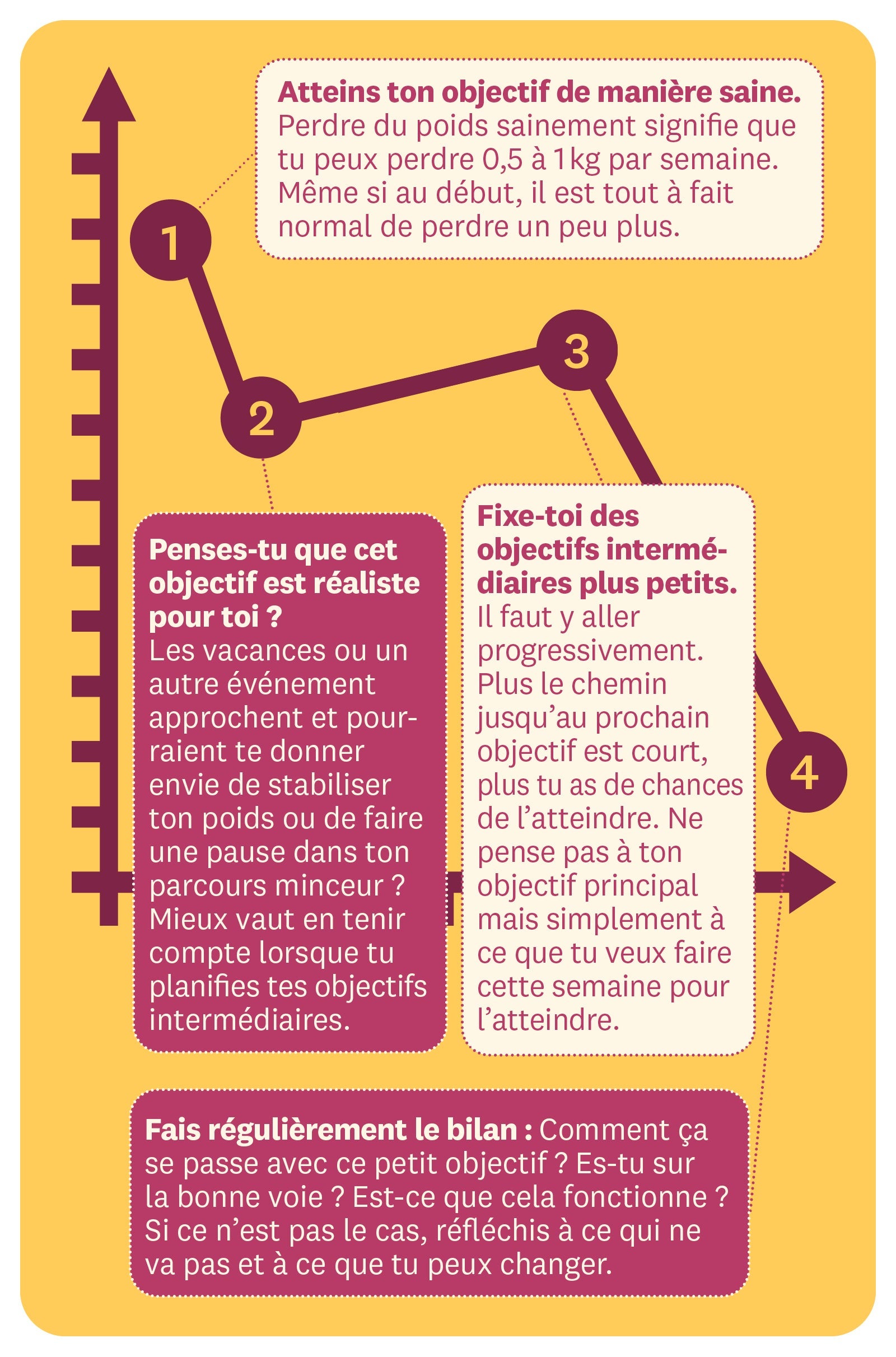 As-tu un objectif de perte de poids spécifique ? Un chiffre magique que tu voudrais atteindre ? Voici comment diviser ton objectif en petites étapes. Suis notre devise : « Oh, attends, ça c’est faisable ! »