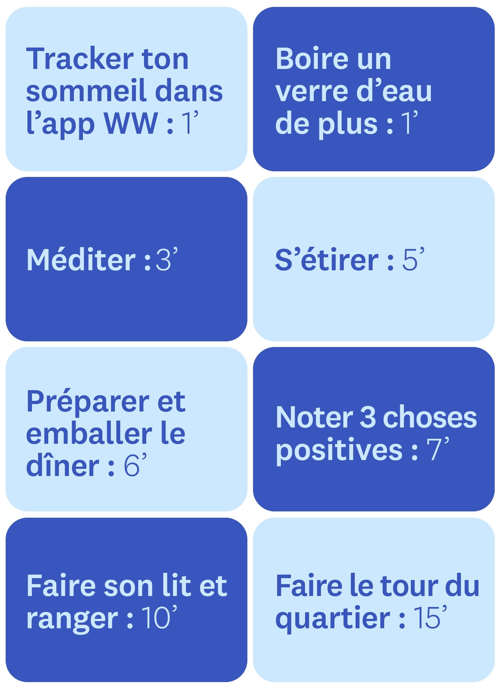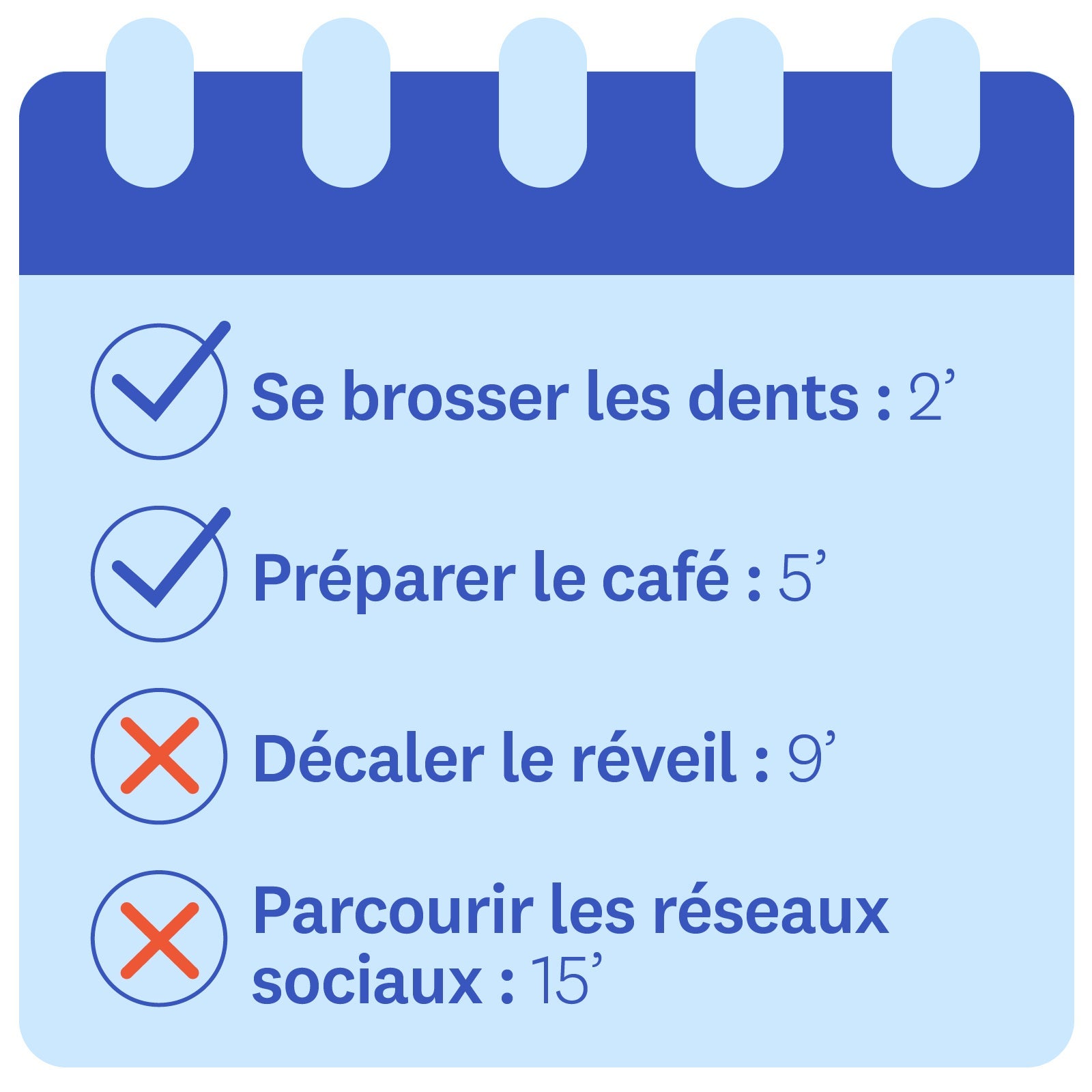 Réfléchis à quelques petites choses très simples que tu peux intégrer à ta routine matinale et qui pourraient devenir des habitudes saines à long terme. Estime aussi le temps que cela te prendrait. Voici quelques idées: