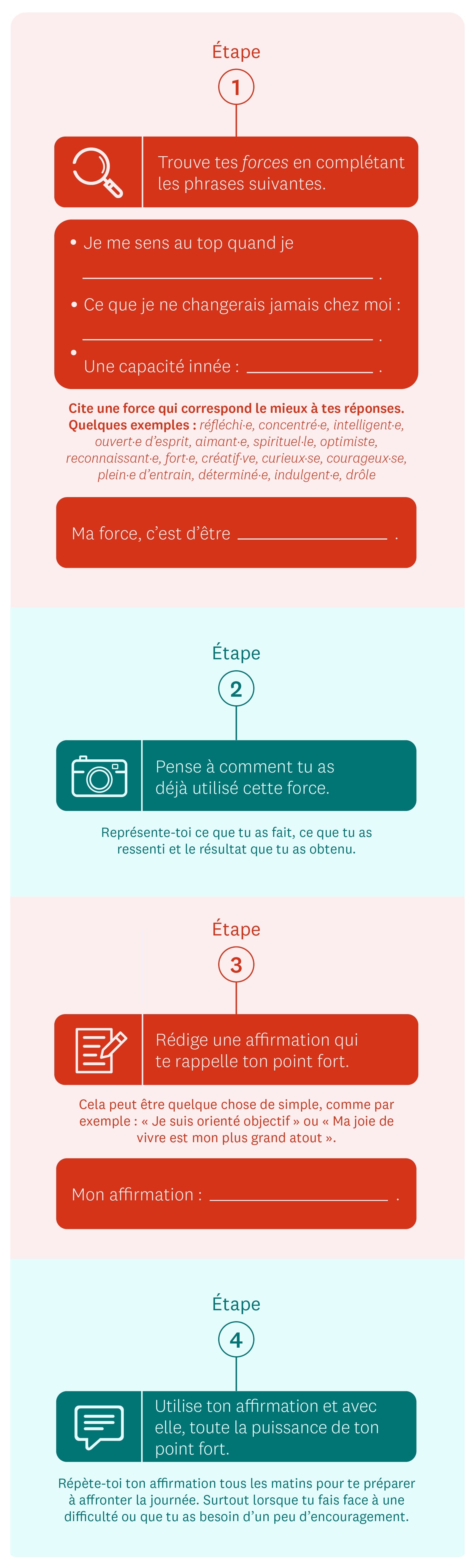 Tu souhaites revenir dans le droit chemin et prendre des décisions saines? Alors demande-toi plutôt: « Quels sont mes points forts? » et ensuite « Comment puis-je utiliser cette force? ». Nos atouts font de nous ce que nous sommes. Pense à ce que tu aimes chez tes amis et ta famille. Cela peut-être le sens de l’humour de ta meilleure amie ou la détermination d’un collègue. Qu’est-ce que quelqu’un retiendrait de toi? Que dirais-tu si tu étais ton ou ta propre ami·e?