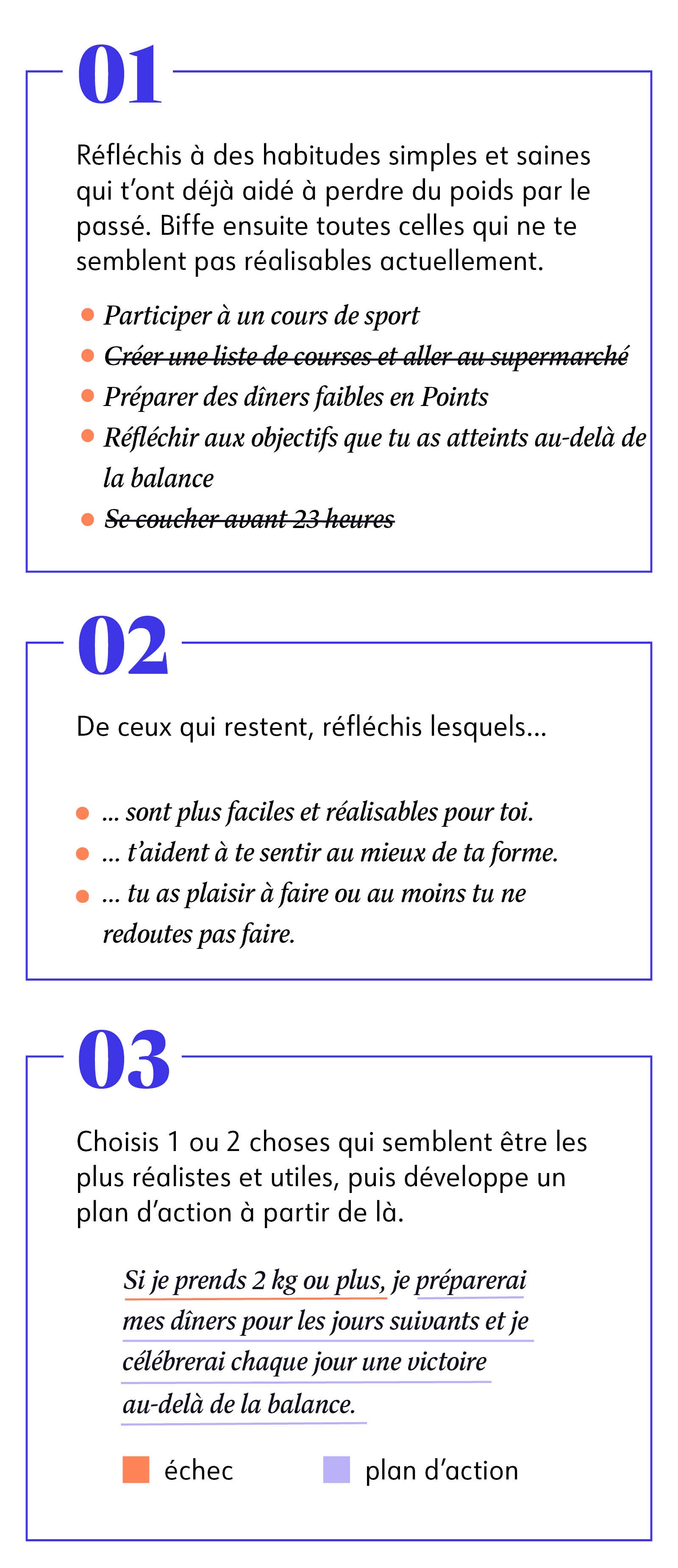 Peu importe si tu as pris du poids, dépassé ton budget hebdomadaire de Points®, ou perdu pied de n’importe quelle autre manière, la première étape est de te rappeler que c’est une partie normale du parcours et que cela arrive à tout le monde. Deuxième étape: mets en œuvre ton plan d’action. Tu n’en as pas encore un? C’est le moment de changer cela!