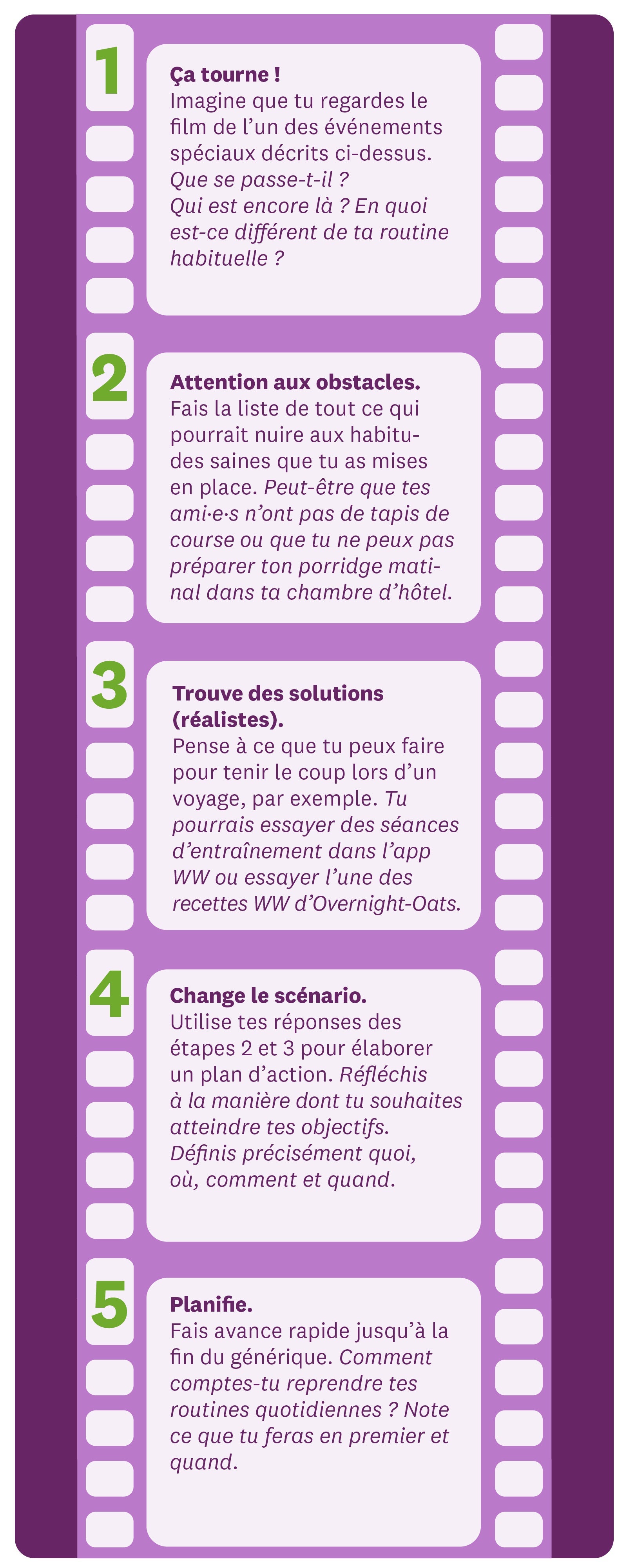 Tu te demandes comment garder le cap pendant un week-end, un voyage d’affaires ou une grande fête ? Tu n’es pas obligé·e de toujours respecter tes routines habituelles. Mieux vaut cependant réfléchir à l’avance à la manière dont tu voudrais surmonter les éventuels obstacles. Tu sauras ainsi exactement quoi faire si la situation se présente.