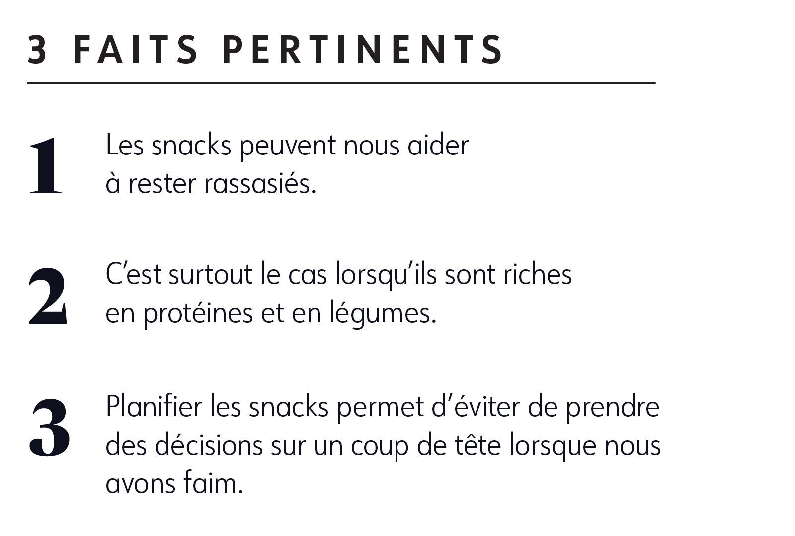 Si tu prévois ce que tu vas grignoter, tu n'auras plus à t'en préoccuper le moment venu. Car tu sais quand et quoi manger pour être rassasié·e!