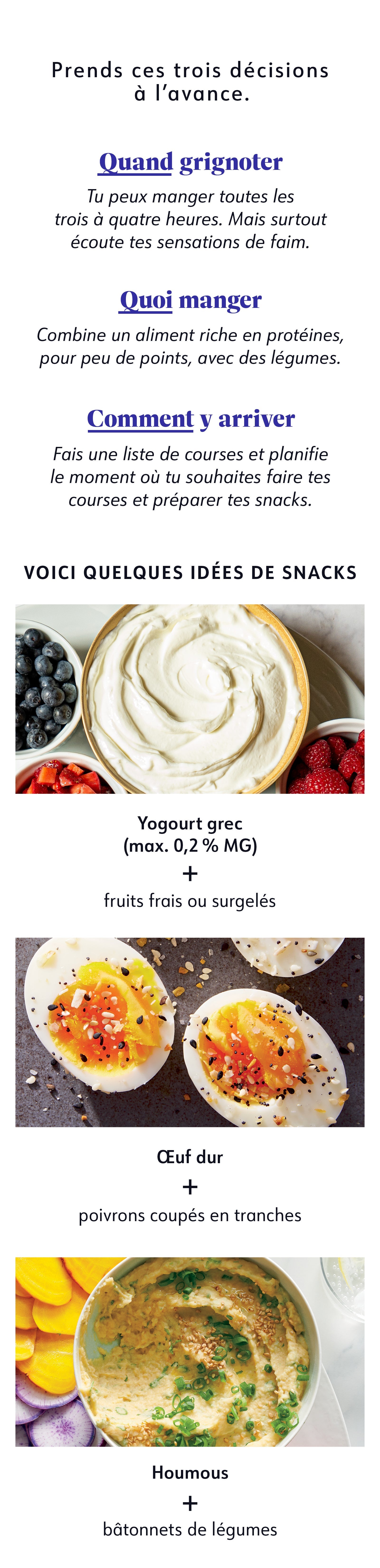 Imagine: Il est trois heures de l'après-midi, ton estomac gargouille. Le souper est encore loin, et il ne te reste que quelques Points® pour terminer la journée. Tu attrapes la première chose qui te tombe sous la main? Non - car tu as en tête les 3 étapes de ce guide des snacks.