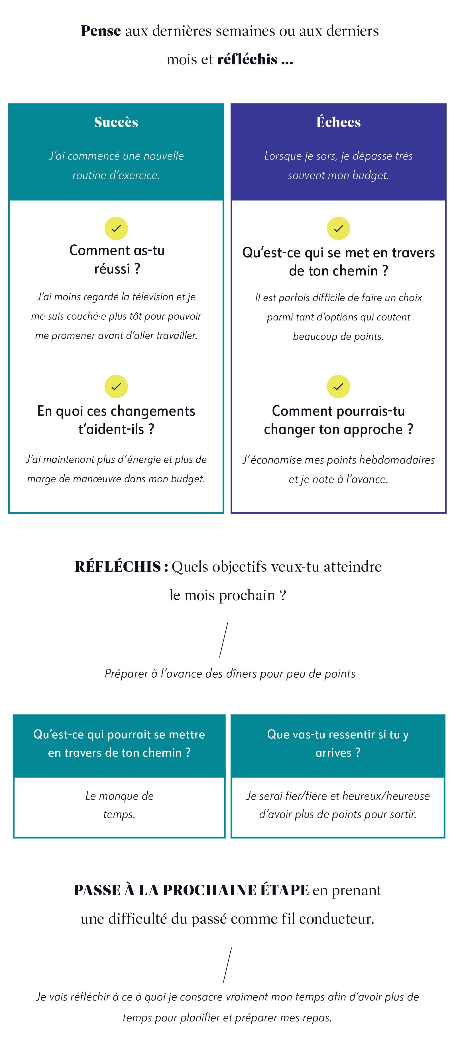 Réfléchir à tes succès et à tes échecs - pourquoi quelque chose a fonctionné (ou pas) et comment tu as surmonté les obstacles (ou pas) - peut t'aider à aborder au mieux de nouveaux objectifs, des difficultés ou un nouveau départ. Alors, tous les quelques mois ou à chaque fois que tu souhaites t'engager dans une nouvelle voie, retourne faire un petit tour dans le passé et décide quelles stratégies, quels conseils et quels comportements t'aideront le mieux à aller de l'avant.