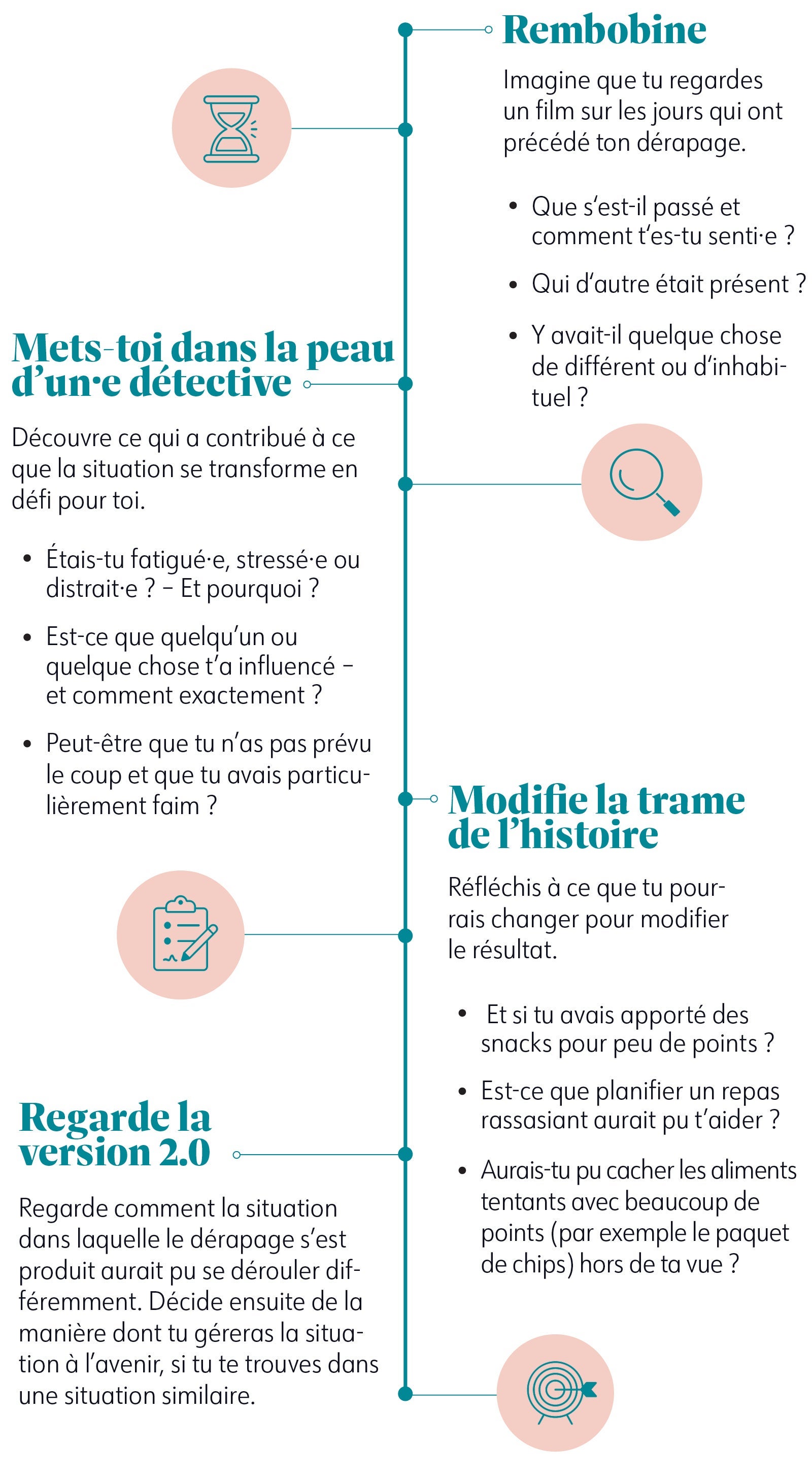 Au lieu de penser à qui, ou à quoi, blâmer, tu devrais considérer les dérapages comme une chance d'évoluer. En repensant à ce qui s'est passé et en prenant conscience de ce qui l'a influencé, il te sera plus facile d'agir différemment la prochaine fois - et d'avoir ainsi plus de succès à l'avenir.