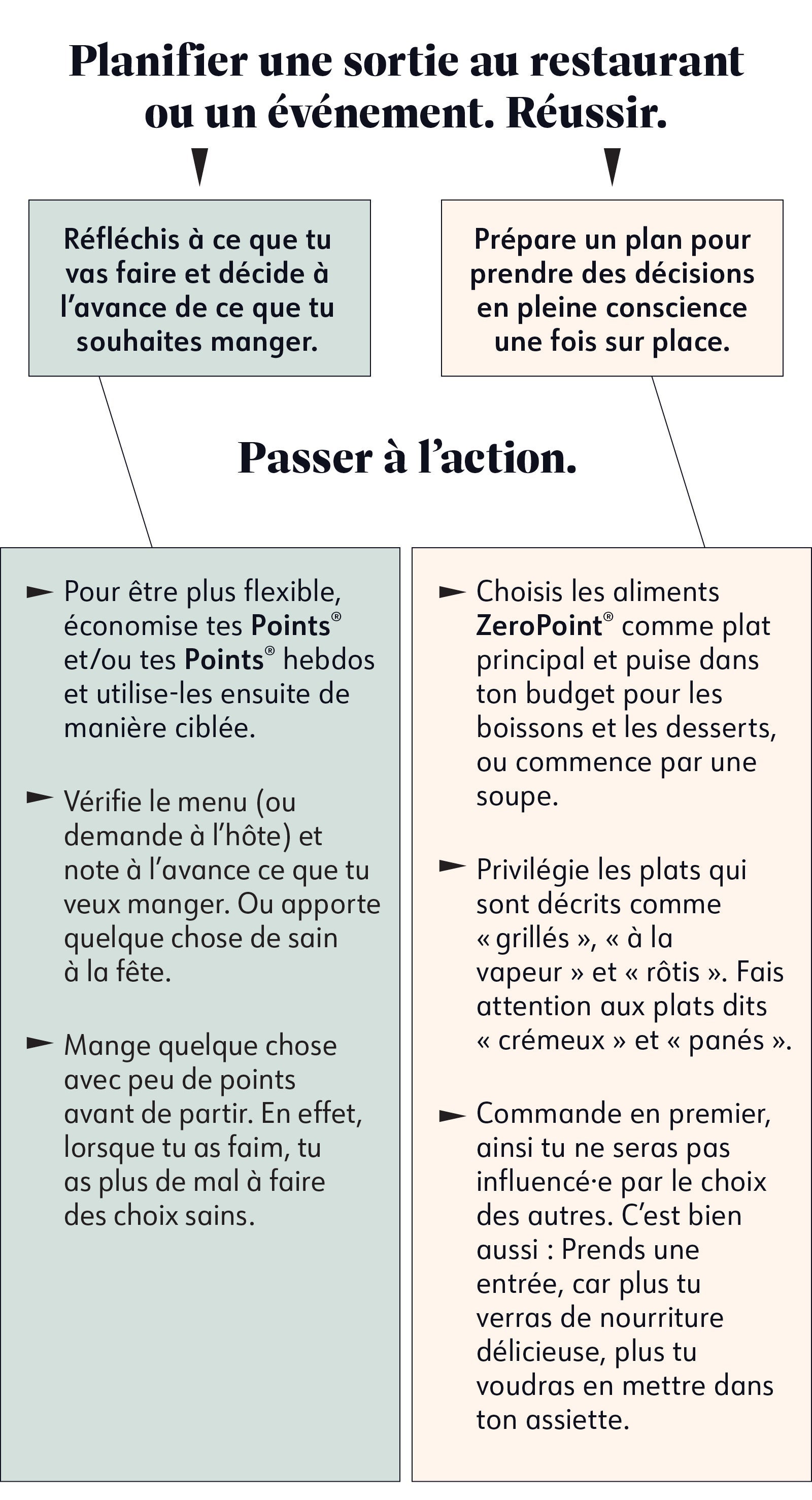 Il en va de même lorsque l'on mange à l'extérieur, par exemple au restaurant ou chez un·e ami·e. La science confirme qu’anticiper et prévoir un plan d'action t'aidera à rester sur la bonne voie.