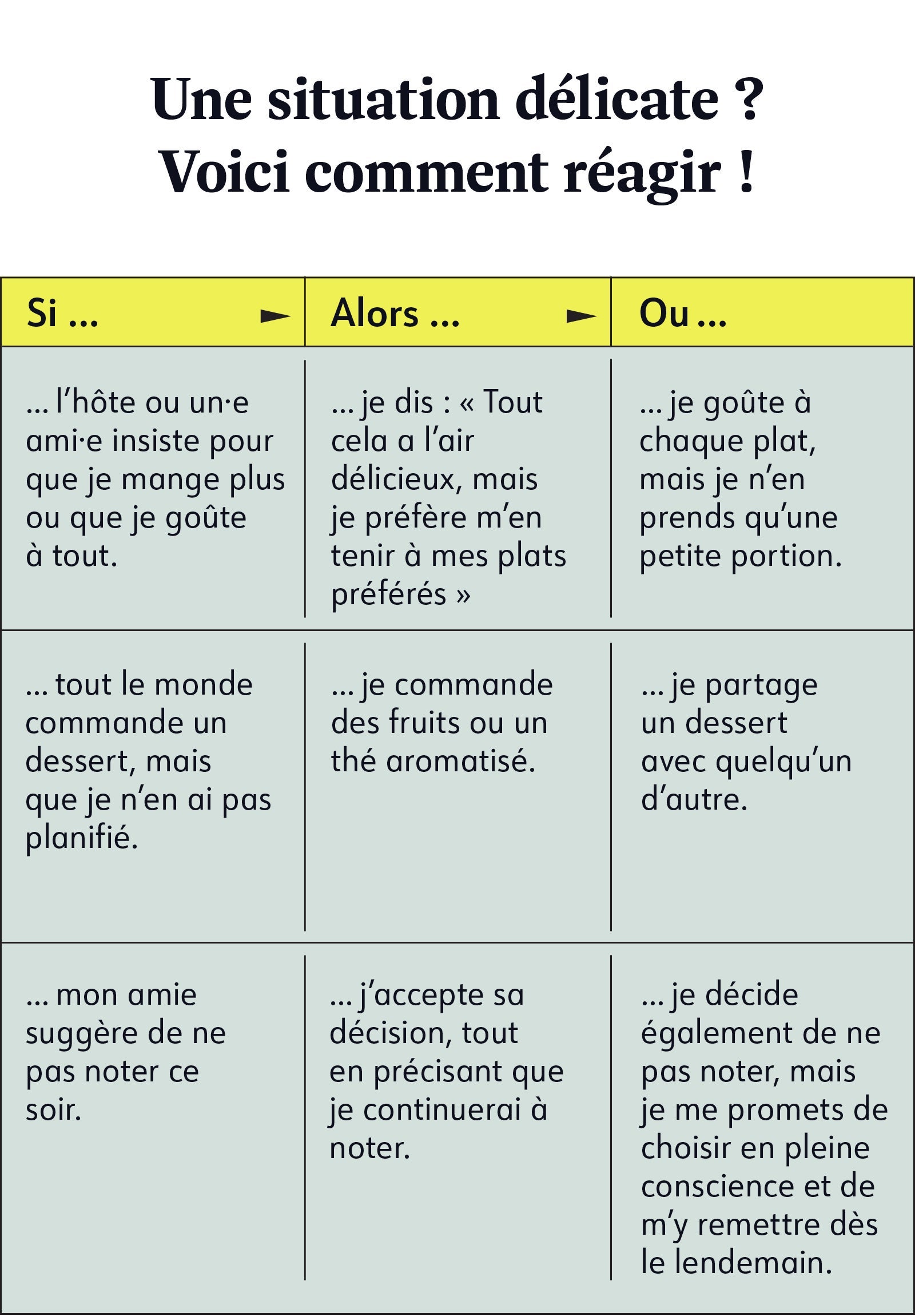 Si nous réfléchissons à l'avance aux défis que nous pourrions rencontrer lors d'un repas au restaurant, il nous sera plus facile de prendre des décisions en pleine conscience.1
