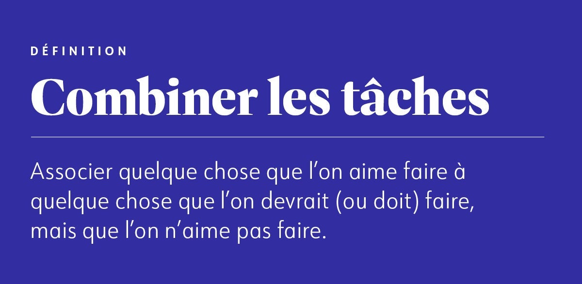 As-tu déjà écouté un podcast ou téléphoné en pliant le linge? Super, tu as déjà réussi à combiner les choses. Tu peux utiliser cette technique pour agrémenter les activités peu plaisantes (mais utiles!) qui t’aident à atteindre ton poids idéal et insuffler une nouvelle vie aux vieilles habitudes et routines.