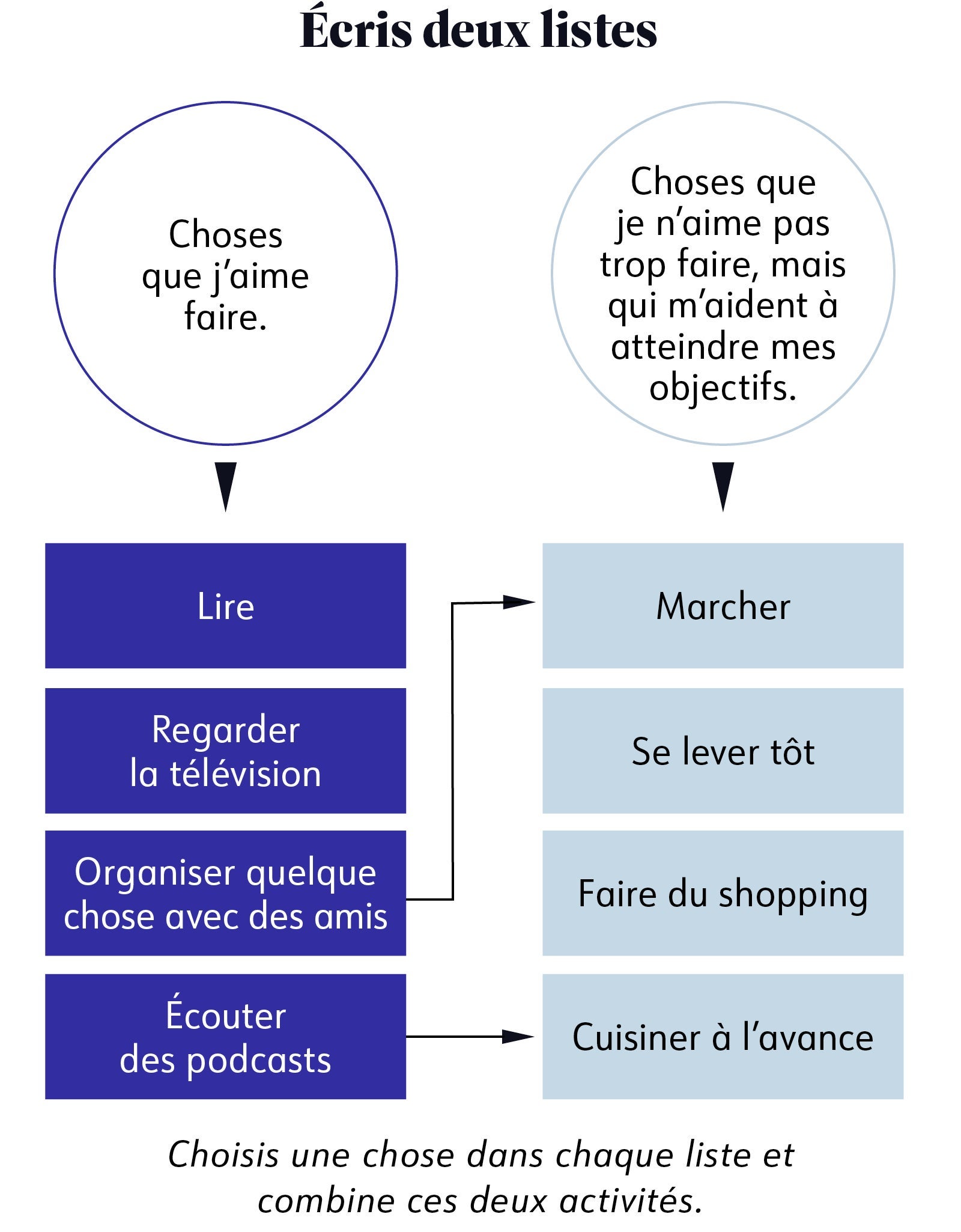 Les comportements et routines qui aident à perdre du poids ne sont pas toujours amusants ou excitants. Ne laisse pas cela t'empêcher d'atteindre tes objectifs. Combine-les avec quelque chose que tu aimes et tu resteras plus facilement motivé·e.