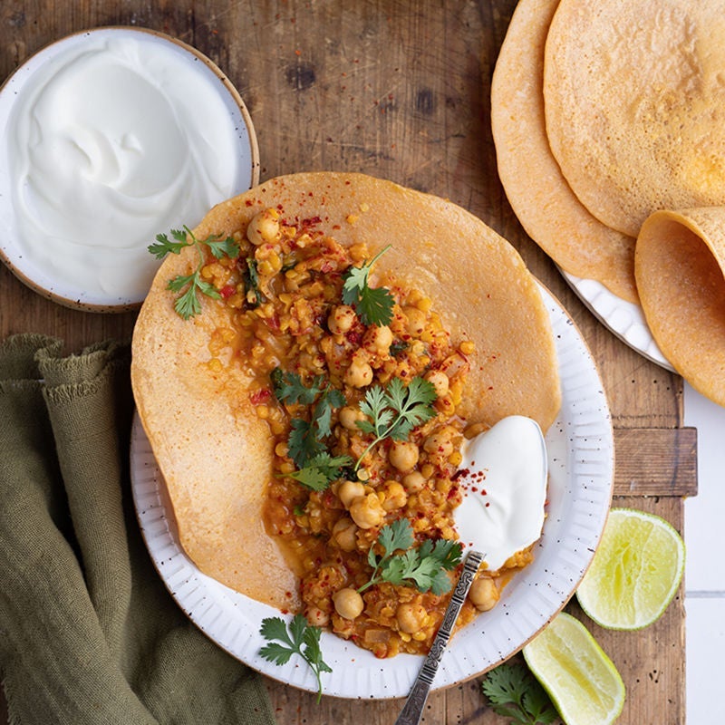 Réduire les lentilles en purée avec de l'eau jusqu'à obtenir une masse homogène. Chauffer l'huile dans une poêle et faire frire les wraps à feu doux pendant environ 10 minutes d'un côté. Retourner le wrap et le faire frire de l'autre côté. Procéder de la même manière avec le deuxième wrap.