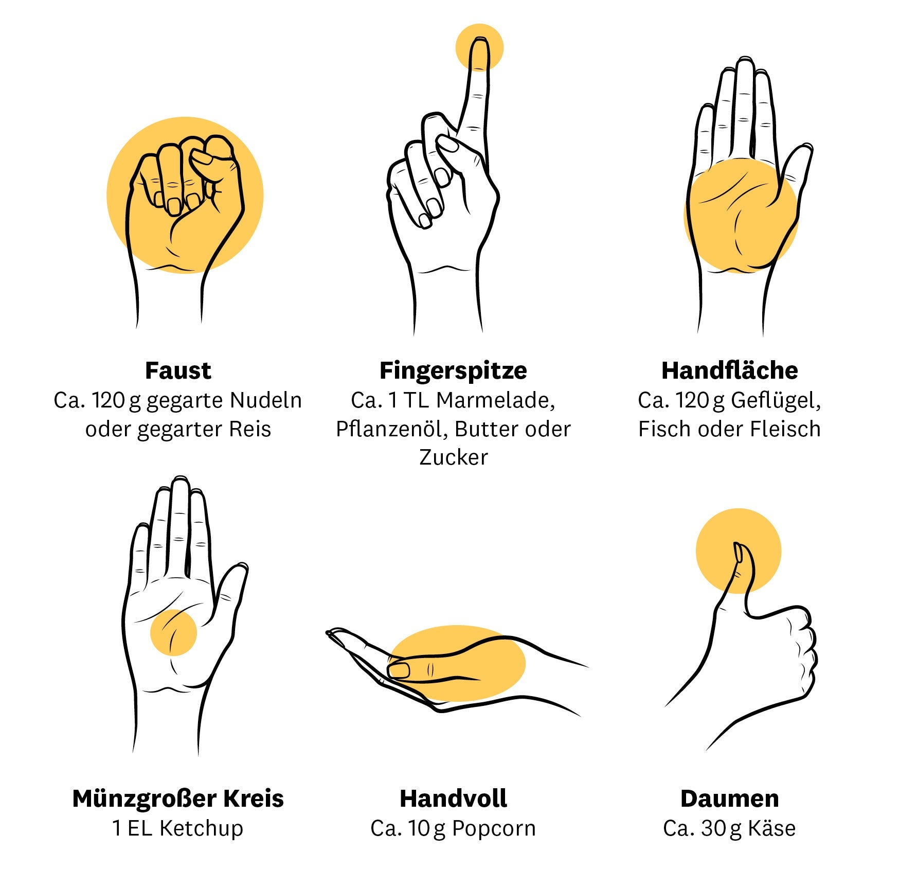 Unterwegs bzw. auswärts zu essen ist dagegen oft eine Herausforderung. Es ist schwer, Portionsgrößen und Points® korrekt zu beurteilen. Schon je nach Hungergefühl und Tellergröße sieht das Nudelgericht in der Kantine oder im Restaurant ganz unterschiedlich aus. Da du dort schlecht die Waage auspacken kannst, nutze deine Hand, um Portionsgrößen einzuschätzen.